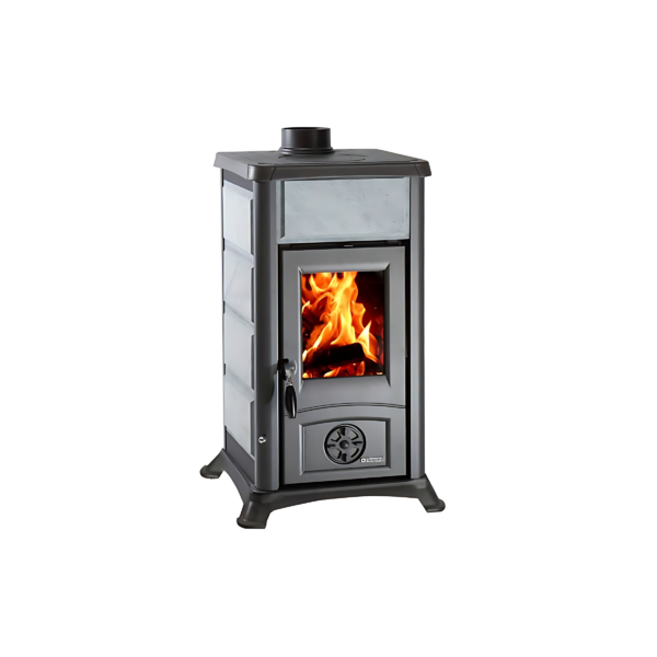 Le poêle a bois Gemma de la marque La Nordica possède un revêtement en pierre naturelle ainsi qu’une puissance nominale de 6 kW ce qui lui permet de chauffer une pièce jusqu’à 172 m3 et accepte des bûches de 25 cm.
